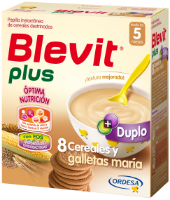 Blevit plus Duplo 8 Cereales y galletas maría es una papilla elaborada a partir de una equilibrada mezcla de 8 cereales (trigo, arroz, avena, cebada, centeno, maíz, mijo y sorgo) y galletas. Las galletas maría proporcionan a la papilla un elevado valor nutricional y la convierten en una excelente fuente de energía con un delicioso sabor y textura