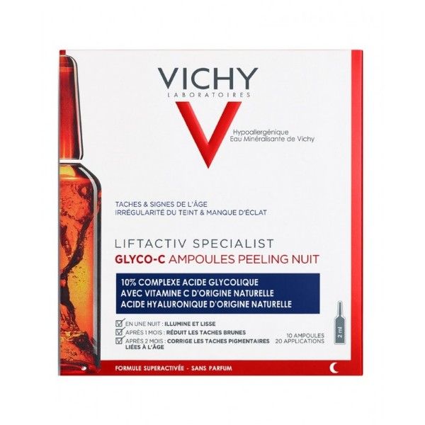 VICHY LIFTACTIV Specialist Glyco-C 10 Ampollas 2ml, es un tratamiento de belleza que actúa sobre las manchas oscuras, reduciendo la hiperpigmentación, unificando el tono de piel, y recuperando la luminosidad. Tiene una fórmula ultraconcentrada con activos anti-manchas y Vitamina C que previene y corrige la hiperpigmentación.