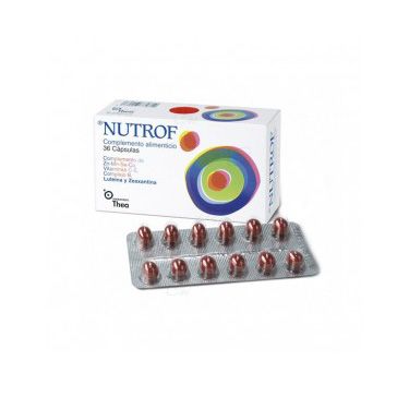 Complemento alimenticio. Complemento de vitaminas, oligoelementos, luteína y zeaxantina. NUTROF ha sido ideado para complementar las necesidades diarias de este grupo de vitaminas, oligoelementos y otras sustancias. El aporte suficiente de estos nutrientes y sustancias con efecto nutricional o fisiológico a través de la dieta, complementándola cuando sea necesario