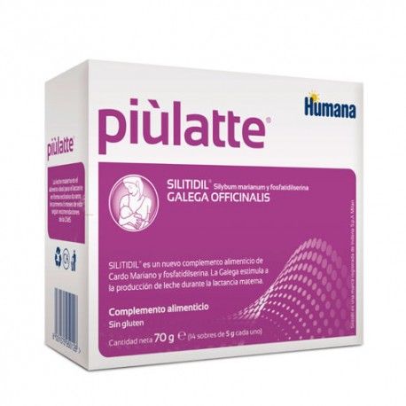 Humana desarrolla sus productos a partir de la combinación de últimas investigaciones científicas, una amplia experiencia y el conocimiento de las necesidades de los más pequeños. Incluye una gama de productos tanto para la nutrición infantil como para la prevención de los problemas comunes en los bebés. Características principales de Piúlatte: Favorece la producción de leche. Contiene Cardo Mariano y fosfatidilserina. Con acción depurativa. Sin gluten. 14 sobres por envase.