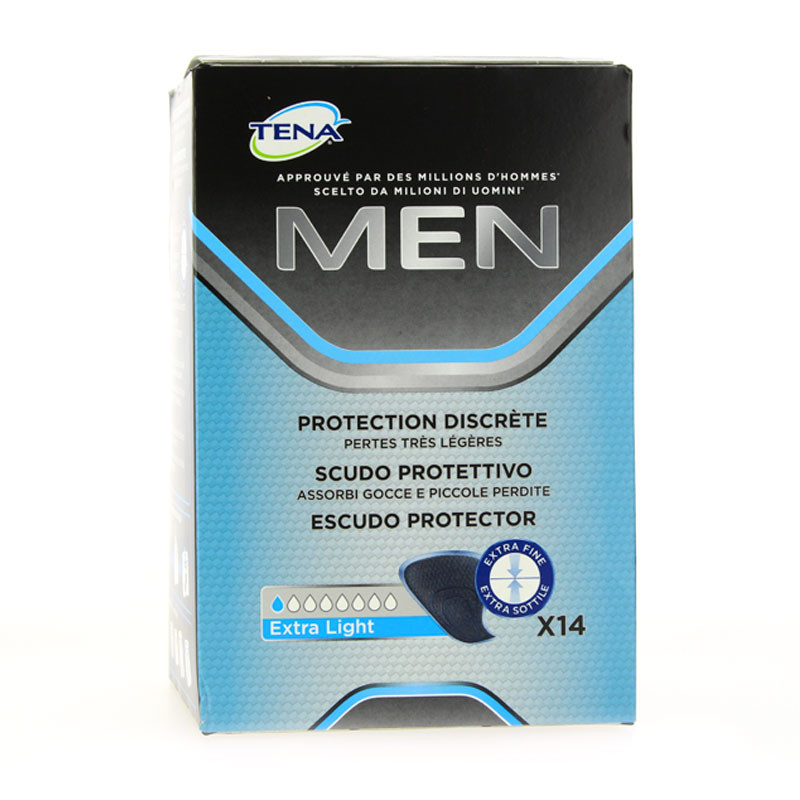 Escudo protecto extrafino especialmente pensado para hombres. Para pérdidas ocasionales. Tena Men Escudo Protector Extra Light es un protector, muy ligero, fino y discreto, con un diseño masculino en color negro y un núcleo absorbente que protege del goteo leve, las pequeñas pérdidas de orina y el olor.