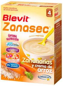 Blevit Zanasec está elaborada a partir de crema de arroz, zanahorias y bifidobacterias y lactobacilos. La combinación de la crema de arroz y las zanahorias favorece la regulación del tránsito intestinal gracias a la digestibilidad y tolerancia de estos alimentos. El arroz que contiene, es un arroz de fácil digestión y tolerancia, que además proporciona la energía necesaria para el bebé. La crema de arroz ayuda a disminuir el número de deposiciones y a aumentar su consistencia.
